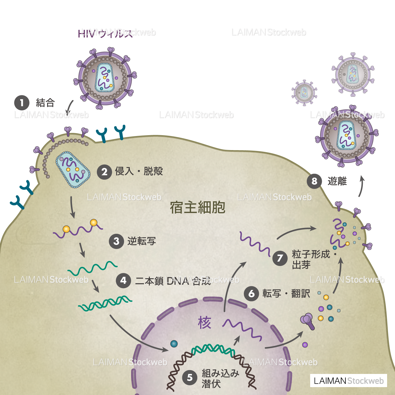 HIVウィルス(生活環・文字あり)
