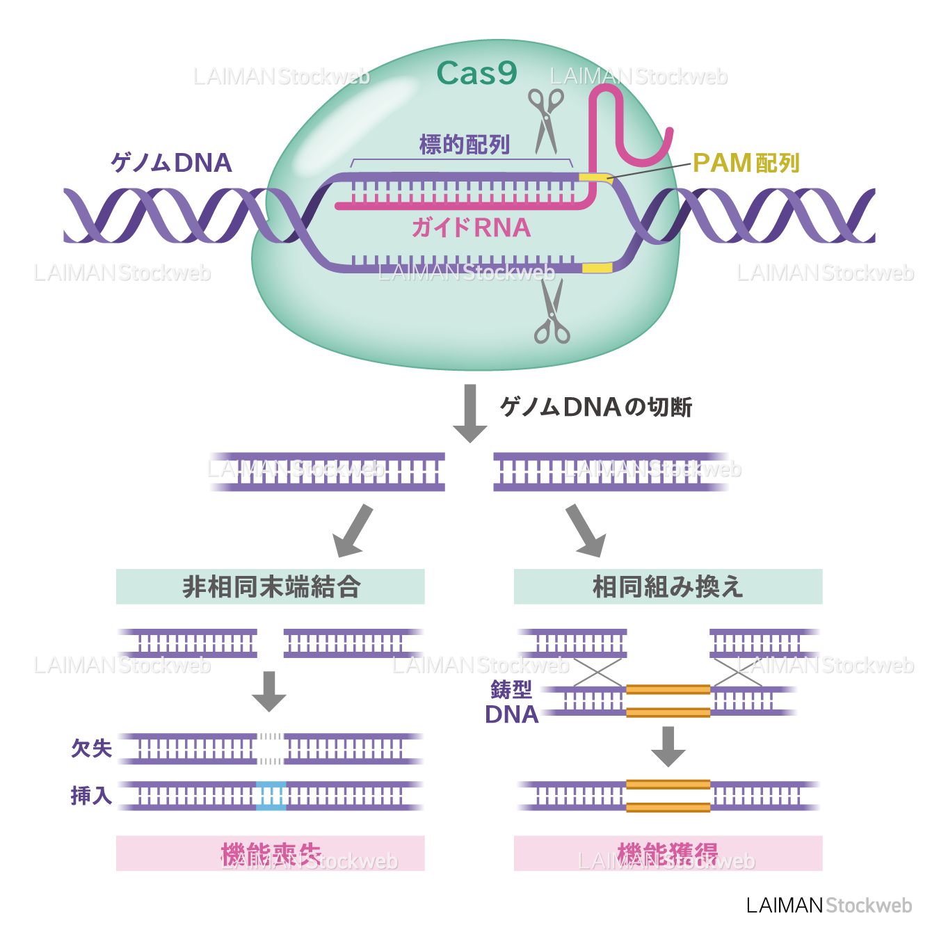 キーワード:ゲノム編集、ノーベル賞、遺伝子、ノックアウト、ノックイン、CRISPR/Cas9、CRISPR-Cas9、CRISPR/Cas、DNA、二本鎖切断、修復、欠損、挿入、外来遺伝子、鋳型DNA、ドナーDNA、非相同末端結合、NHEJ、相同組み換え、HDR