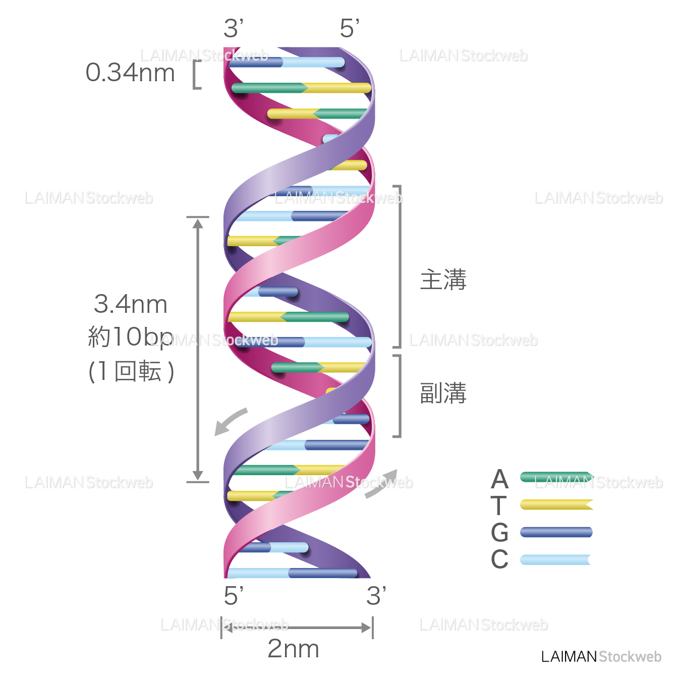 キーワード:DNA、二重らせん、染色体、遺伝子、遺伝学、鎖、リボン、リボンモデル、塩基対、主溝、副溝