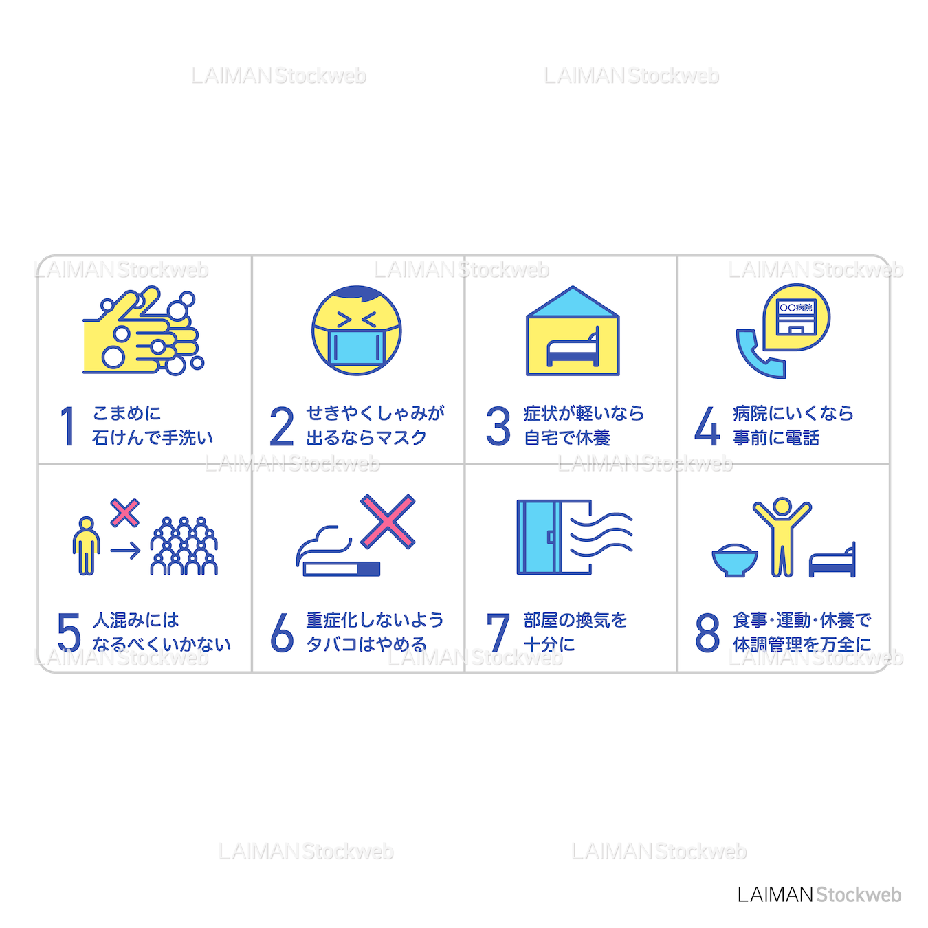 キーワード:感染症、感染症対策、予防、ウイルス、手洗い、せき、くしゃみ、マスク、人混み、タバコ、換気、栄養、休養、運動